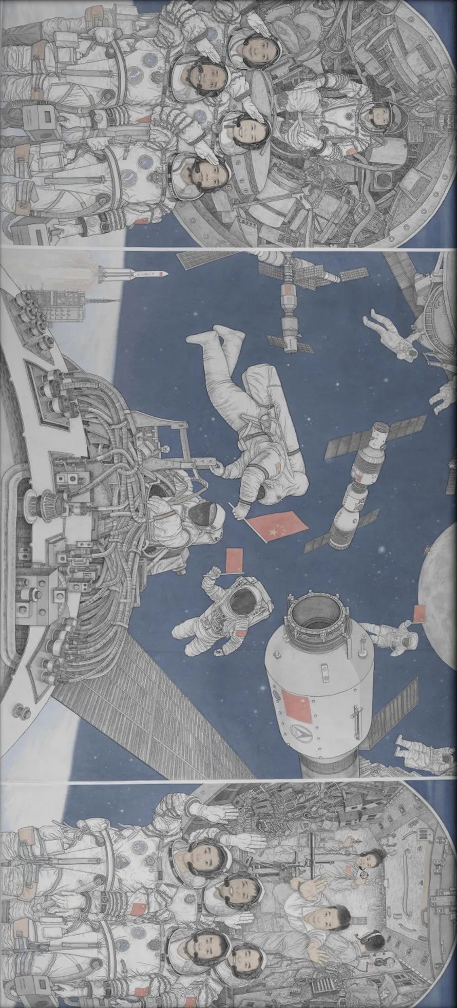 画面左部的四位航天员行军礼,代表即将出征;左上半部分在太空舱的是杨利伟,他是中国的第一位航天员;画面右半部分的四位航天员挥手致意,代表着胜利凯旋;右上半部分的王亚萍等三人,组合再现了太空授课的场景,这几个场景都极具航天科技的代表性。在画面中间表现了大面积的浩瀚宇宙,这一部分表现了中国航天员翟志刚第一次出舱的经典定格以及神舟九号飞船和天宫一号成功对接的完美瞬间,也寓意了中国日益腾飞的航天技术及航天成就。此外,这件作品用较为轻松的笔法来塑造人物、服饰、器物的基础,然后以墨线为主的勾勒来表现轮廓。以灰蓝色调贯穿三幅画面,形成一个浩瀚宇宙的主色调。在黑白墨笔的衬托下,航天员温润的肤色和他们左臂上鲜红的国旗映衬出他们自豪而坚毅的精神面貌。为了更全面真实地还原航天工程的全貌,画家还精准描绘了航天员的形象,航天器内复杂机械结构等细节,包括各种航天标识、航天员的服饰、手表、气压表等等,而这些都使观者对于这一史诗历程获得了身临其境般的真切体验。