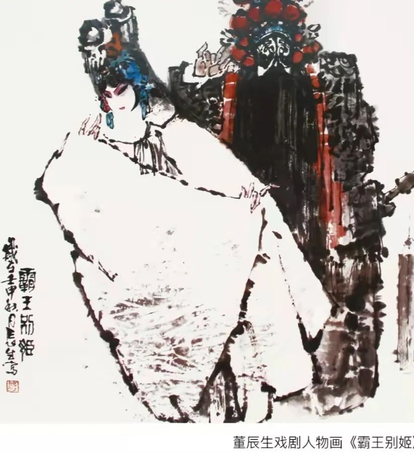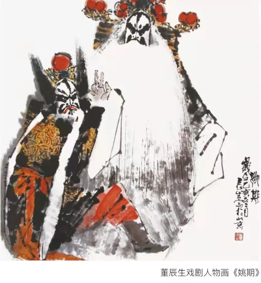 在董老的画册里,京剧人物画占有很大的比重。他以最简练的笔墨,捕捉人物一刹那的身姿,把游移流动之态,化为永恒凝固之美。《贵妃醉酒》抓住杨玉环展腰舒袖、扬眉回眸的瞬间,写尽了绝代佳人寒宫莺咽,醉态曼妙的凄楚。《金玉奴》将玉奴的娇羞痴情,老父的幽默练达,特别是莫稽生活上的饥寒交迫、心理上的贪婪凶残刻画得淋漓尽致。《打焦赞》把杨排风英姿飒爽,焦赞跌坐地上,又羞又恼却又无可奈何的神态跃然纸上……我虽然不懂京剧,但仍为画中人物的悲欢离合、喜怒哀乐所感染。这一幅幅精美的画面,绝不是对舞台原形的简单摹写,而是画家在揣摩人物内涵的基础上的再创作。董老说:“我喜欢京剧。解放前的秦皇岛有3个戏园子,1个露天戏场。我家左邻右舍好多是唱戏的。他们演戏,我免费看戏,久而久之深受感染。我了解演员的生活,不仅是他们的舞台生活,还有他们的现实状况。有些老艺人,当他们倒了嗓儿,染上大烟瘾,或是过了艺术青春期,生活是很坎坷、很艰难的。有不少人穷困潦倒,境况很惨。因为我对演员的了解是立体的,是活生生的,所以,画出来的舞台人物,就不是一般的舞台画,而是有血有肉,是介入生活的”。这里面包含着对人生的体悟,也包含着深厚的生活和文化底蕴的积淀。