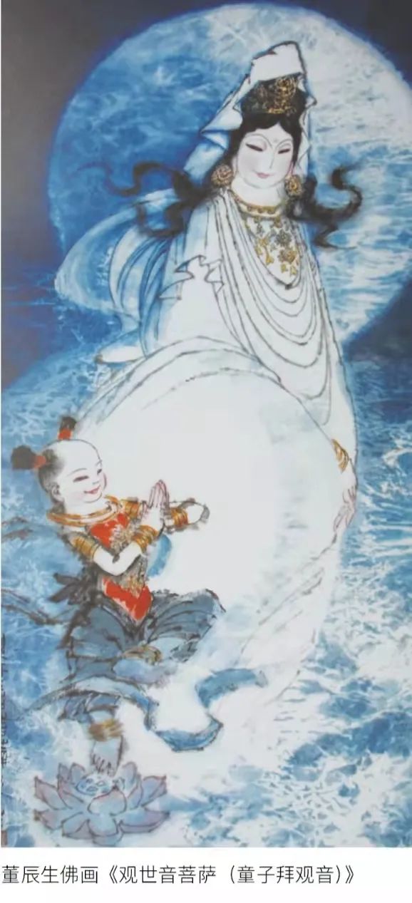 说到佛画,董老显得十分兴奋。这是他离休后闯入的一个新领域。如果说他6岁从父学习佛画,是兴趣使然,不过借以糊口而已,而此时的佛画则是艺术追求上的升华,是他的艺术表现从大开大阖向静谧平和风格的巨大转变,是从外在形式美向内在含蓄美、神秘美的深层开掘。离休后,本该颐养天年的董老花费十数年时间,潜心研读佛学史和佛教有关的经典著作。他深谙佛教教义的真谛和佛教美术的法度,并从这两个层面发挥最灿烂的想象,为我们捧出了沉甸甸的《佛画世界》。其中收录的70余幅艺术精品,有的笔墨沉雄,遒劲有力;有的用笔婉约,轻盈若飞;有的华美奇妙,极尽浪漫,真是千变万化,匪夷所思,为中国画开辟出一个新的天地。