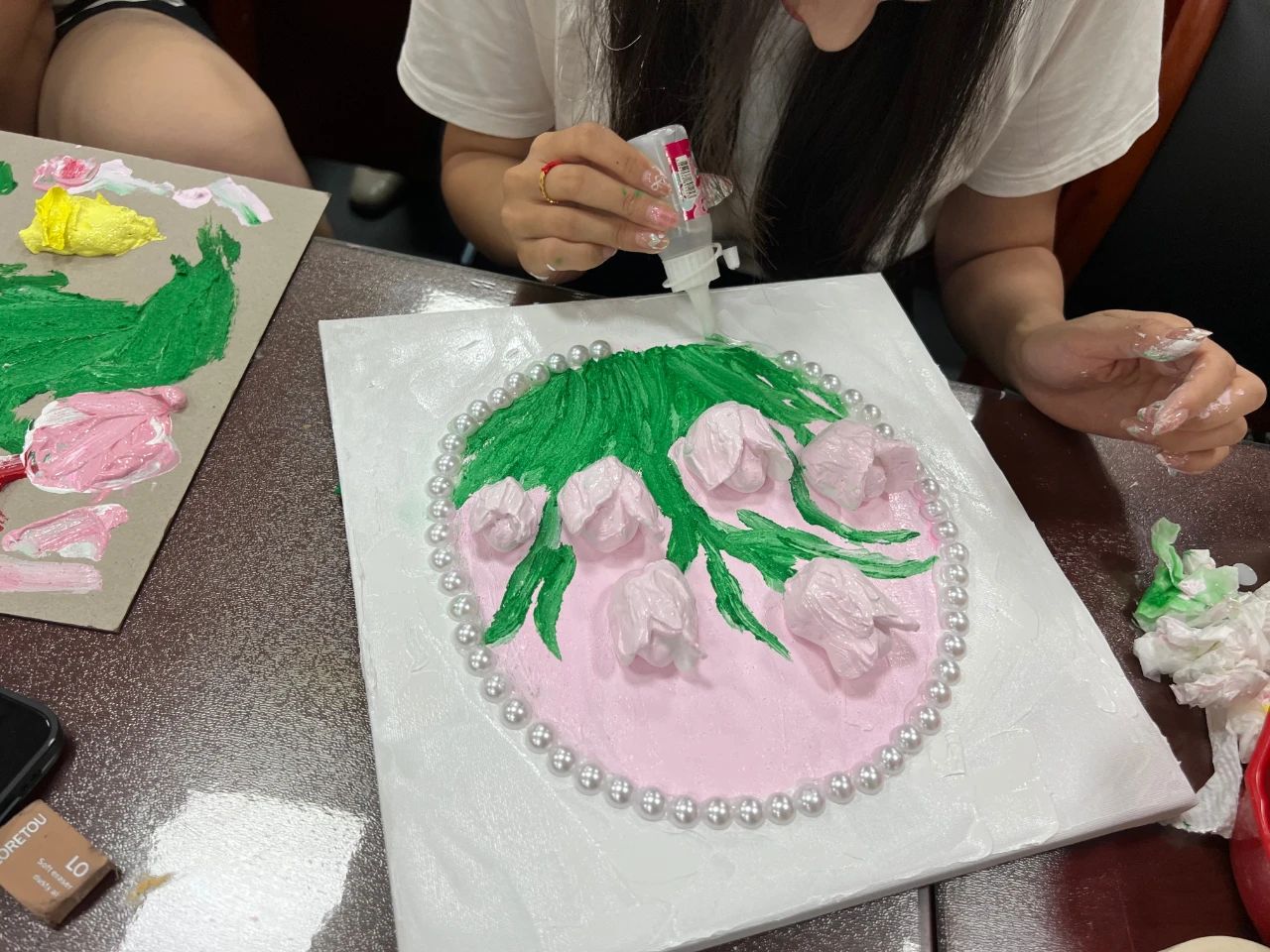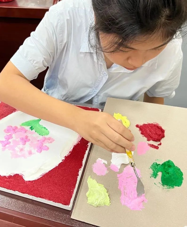 随后,在老师的指导下,大家开始进行创作:拿到材料后分别在颜料中加入石英砂,然后用画笔或刮刀调配均匀,再填充在已经勾勒好的线稿轮廓中,轻轻刷上各种缤纷的颜料。颜料中掺杂着石英砂,一笔一笔涂在画布上“沙沙”作响,大家都感到十分解压和治愈。最后老师提醒大家肌理画的重点在于“肌理”二字,一定要用铁铲刮出纹理感。