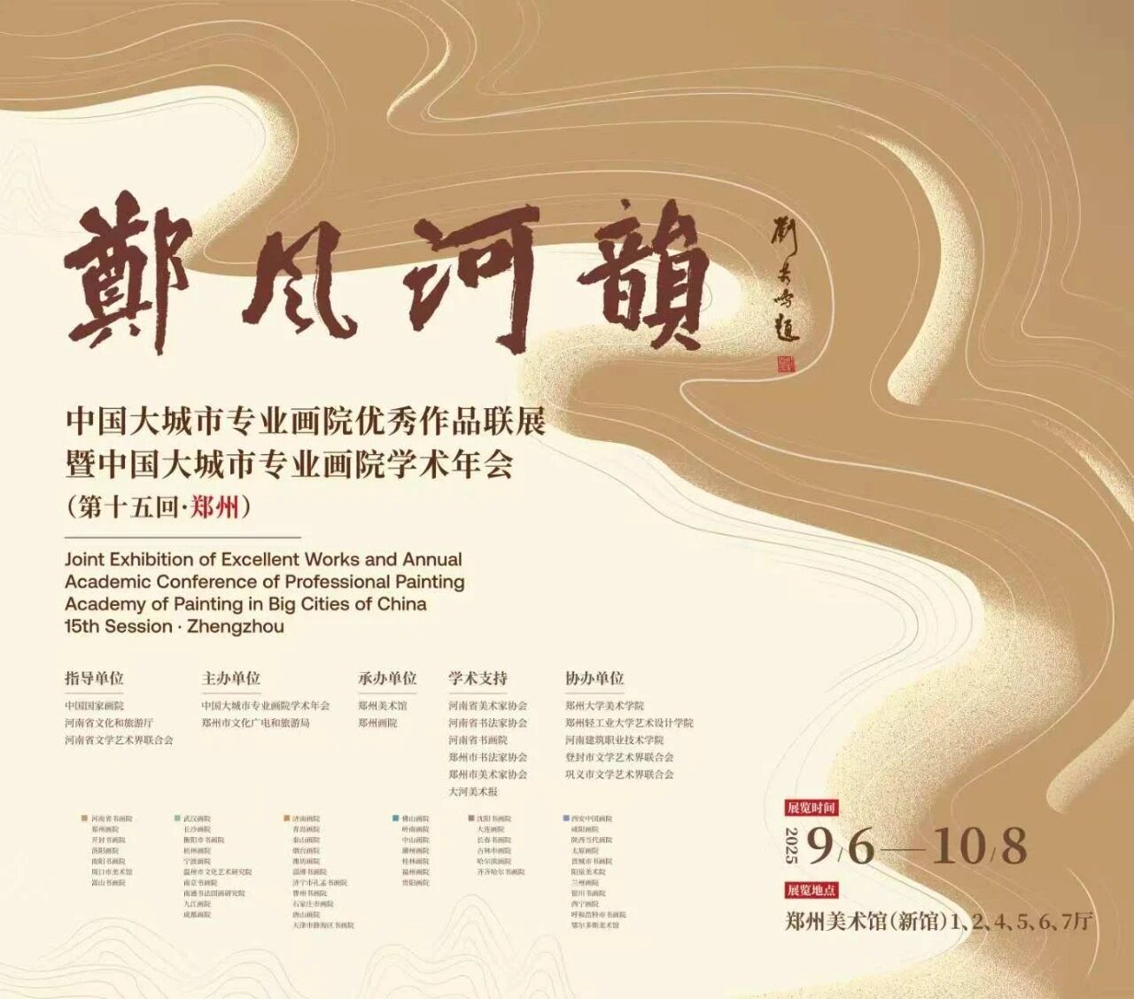 9月15日上午,由中国国家画院、河南省文化和旅游厅、河南省文学艺术界联合会指导,中国大城市专业画院学术年会、郑州市文化广电和旅游局主办,郑州美术馆、郑州画院承办,河南省美术家协会、河南省书法家协会、河南省书画院、郑州市书法家协会、郑州市美术家协会、大河美术报学术支持,郑州大学美术学院、郑州轻工业大学艺术设计学院、河南建筑职业技术学院、登封市文学艺术界联合会、巩义市文学艺术界联合会协办的“郑风·河韵”中国大城市专业画院优秀作品联展(第十五回·郑州)在郑州美术馆开幕,本次展览汇聚全国51家专业画院、近500件精品力作,题材涵盖历史、现实、自然、人文,风格兼顾传统与创新,既是全国画院艺术家创作成果的集中展示,更是新时代中国美术事业繁荣发展的生动写照。唐山美术馆(唐山画院)副馆长邓天平,策展部主任秦文志参加了本次联展及学术活动,并选派刘亚安、王善满、薛方明、邓天平、李铁林、安昕昕、秦文志7位艺术家作品参展。