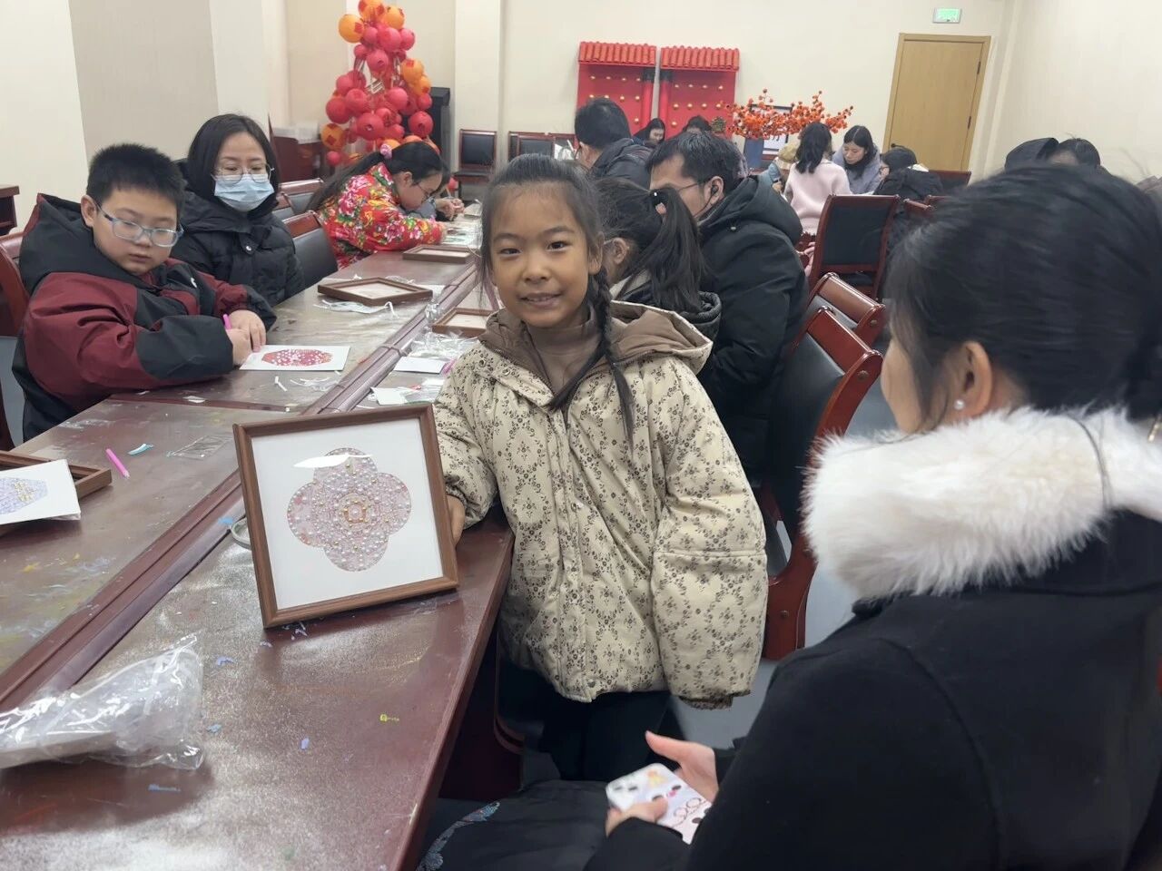 一幅幅独具童趣的宋锦珍珠画完成,孩子们脸上满是自豪,高举作品合照。